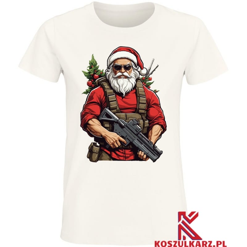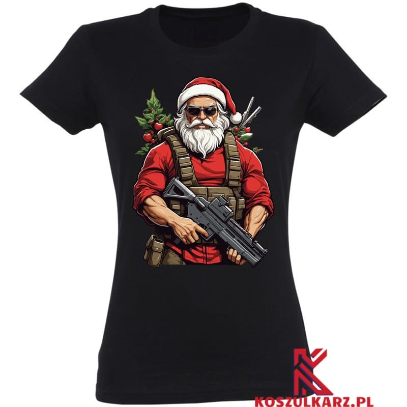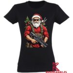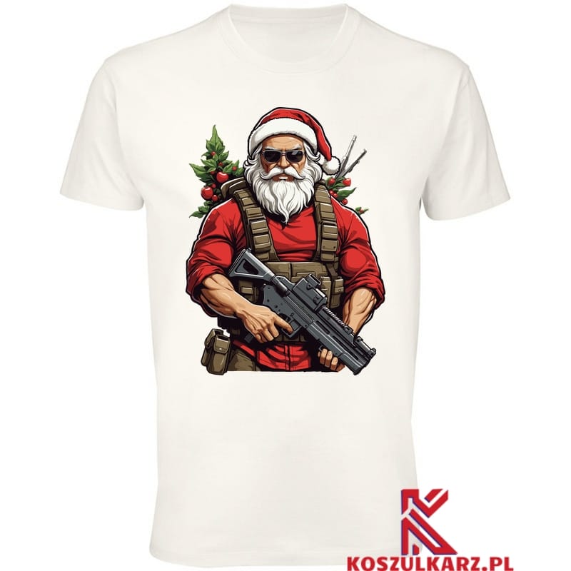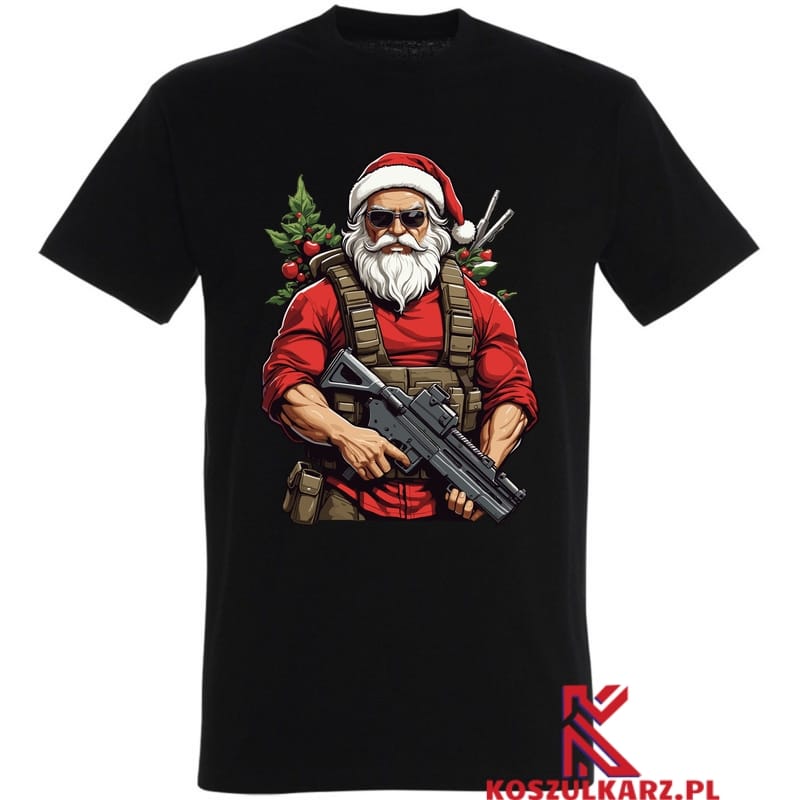 Świąteczny Bohater Święty Mikołaj jakiego nie znałeś – Ta koszulka przedstawia Świętego Mikołaja w niecodziennym, bojowym wydaniu, kompletnie uzbrojonego i gotowego do akcji. Idealna dla tych, którzy cenią sobie oryginalne i niekonwencjonalne podejście do świątecznych motywów.