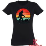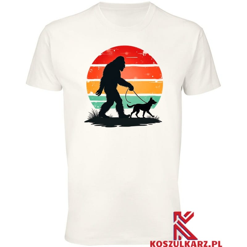 Nadruk na tej koszulce przedstawia malowniczy retro zachód słońca, z charakterystycznymi pastelowymi kolorami, w tle którego widać postać spacerującą z psem. To ujęcie łączy w sobie relaksującą atmosferę spaceru z ulubionym czworonogiem oraz estetykę vintage, co nadaje koszulce wyjątkowy, nostalgiczny klimat. Idealny wybór dla miłośników przygód na świeżym powietrzu, którzy cenią styl retro.