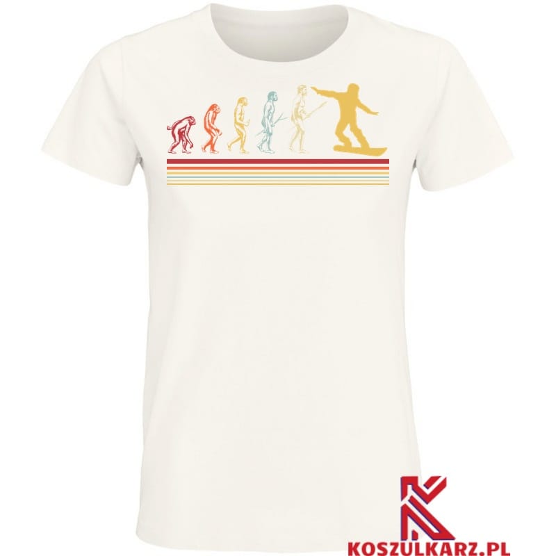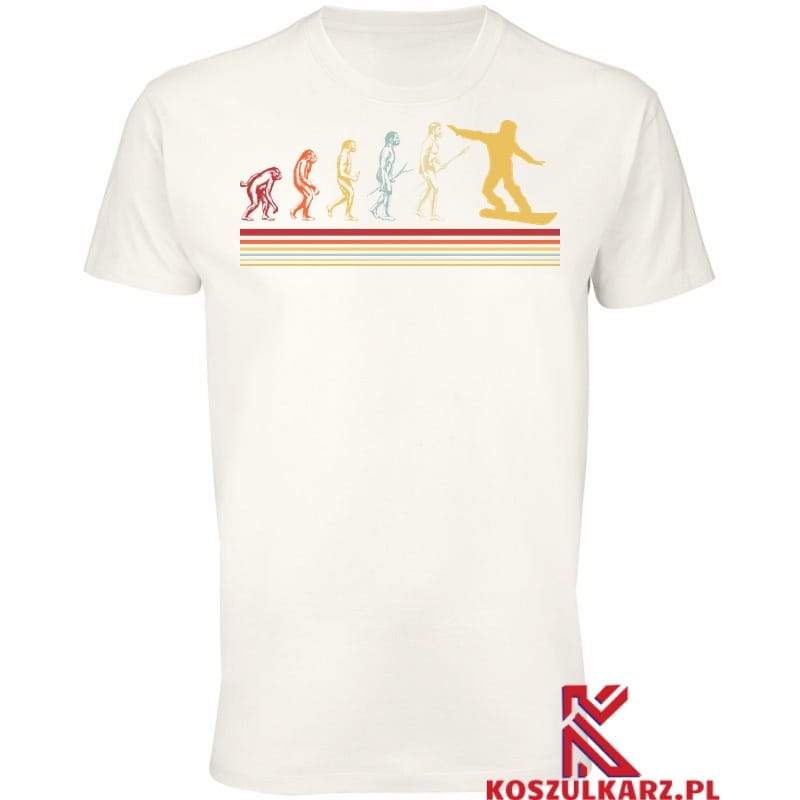 Na tej koszulce znajduje się fascynujący nadruk ukazujący ewolucję snowboardu od jego początków w latach 60. XX wieku do współczesnych, zaawansowanych modeli. Grafika przedstawia różnorodne style desek, od klasycznych konstrukcji po nowoczesne, które zrewolucjonizowały sposób jazdy. Koszulka jest idealna dla tych, którzy chcą wyrazić swoją pasję do snowboardu i jego historii.