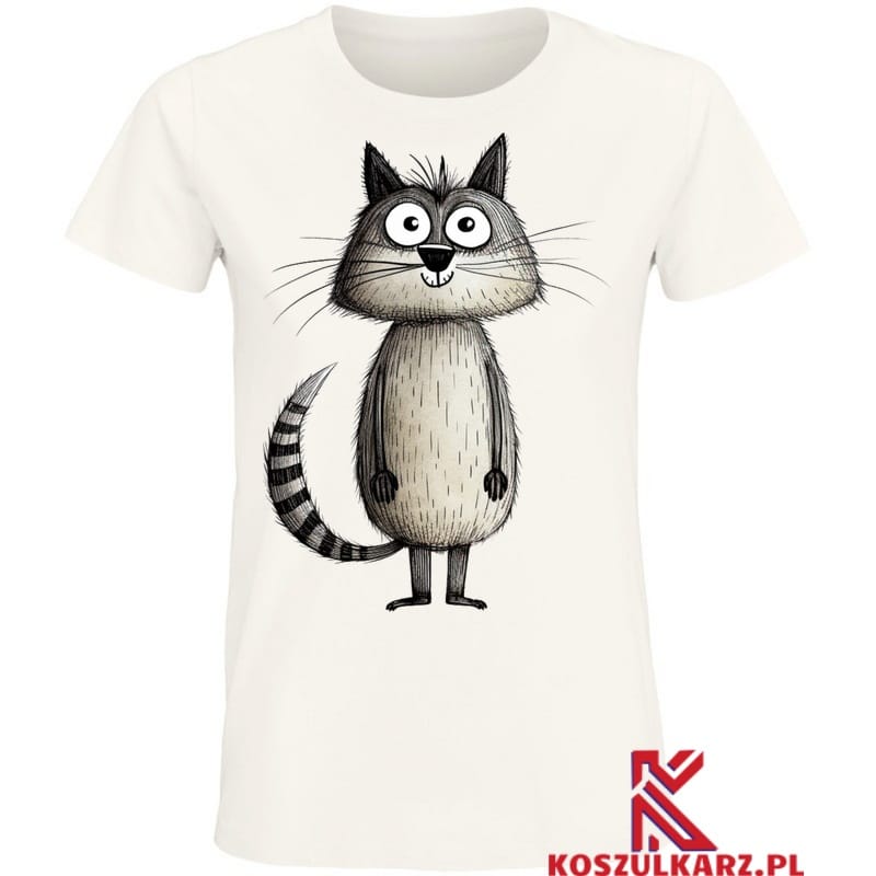 Rysunkowy szary kot w sympatycznej pozie emanuje ciepłem i przyjaznym duchem. To świetny sposób na wyrażenie swojej miłości do kotów oraz indywidualności, czyniąc tę koszulkę doskonałym elementem codziennych outfitów.