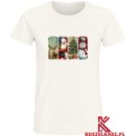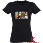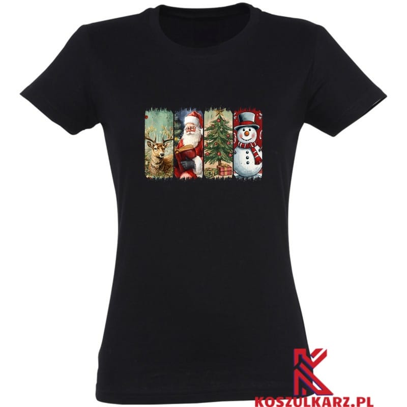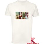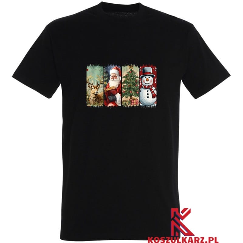 Świąteczna koszulka retro z reniferem, Mikołajem, choinką i bałwanem. Wykonana z miękkiej bawełny premium, dostępna w rozmiarach S-2XL. Świąteczny klimat w klasycznym stylu!