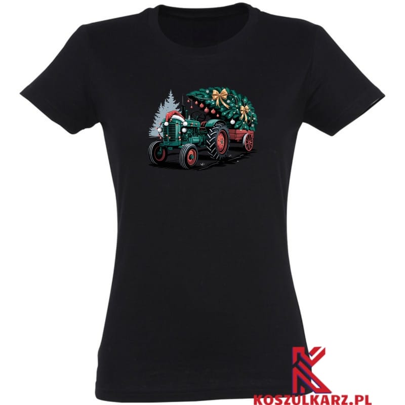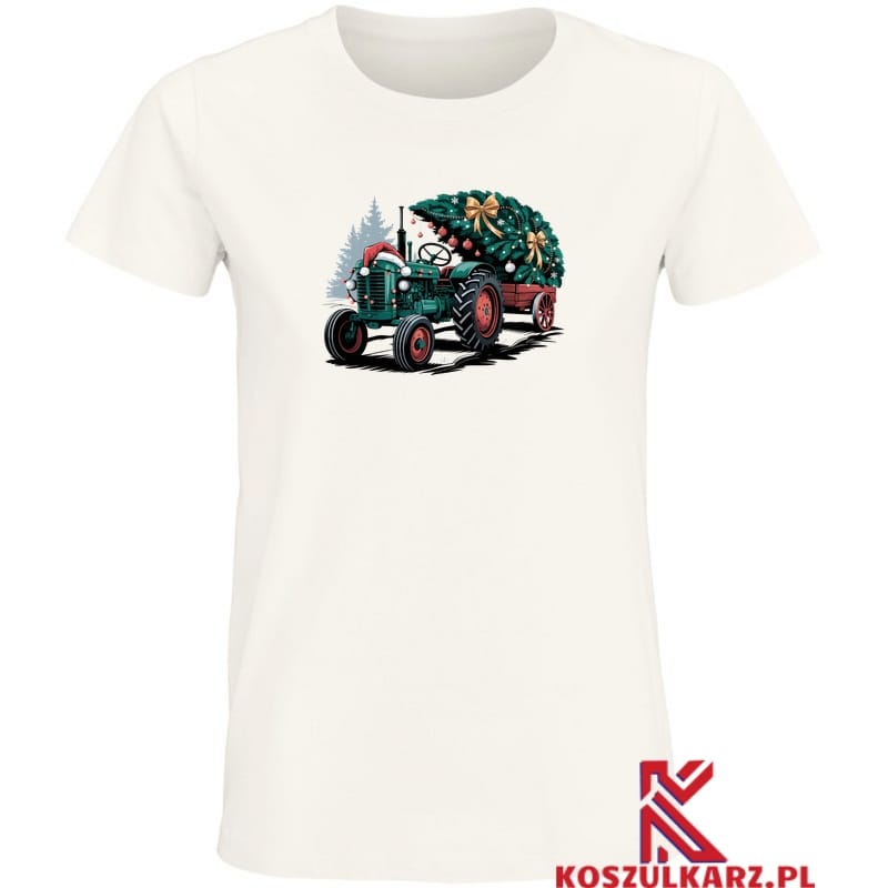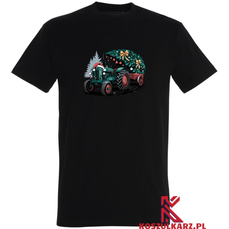 Świąteczna nostalgia na kołach – Ta koszulka Traktor z Choinką prezentuje retro traktor przewożący świąteczne drzewko, łącząc klasyczny wiejski obraz z radosnym duchem świąt. Idealna dla miłośników farmy i retro motywów.